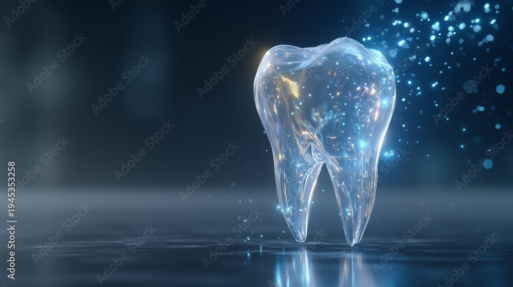Transparent illuminated tooth model representing dental prosthesis and digital dentistry concept, highlighting restoration, implant planning, and biomaterial innovation. #1945353258