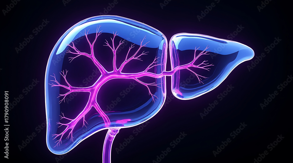 Transparent liver with neon purple glowing veins, detailed anatomy illustration showing internal structure and vascular system in futuristic style #1790908091