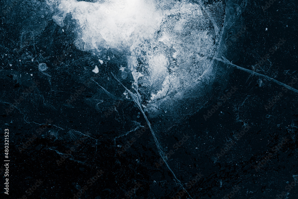 Transparent surface of the ice with cracks and frozen air bubbles on black background. #480321523