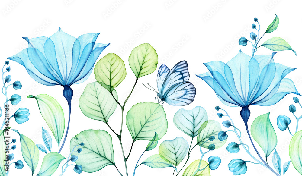 Transparent watercolor blue rose with eucalyptus and butterfly. Long seamless horizontal border floral illustration. Isolated hand drawn botanical illustration #1845211186