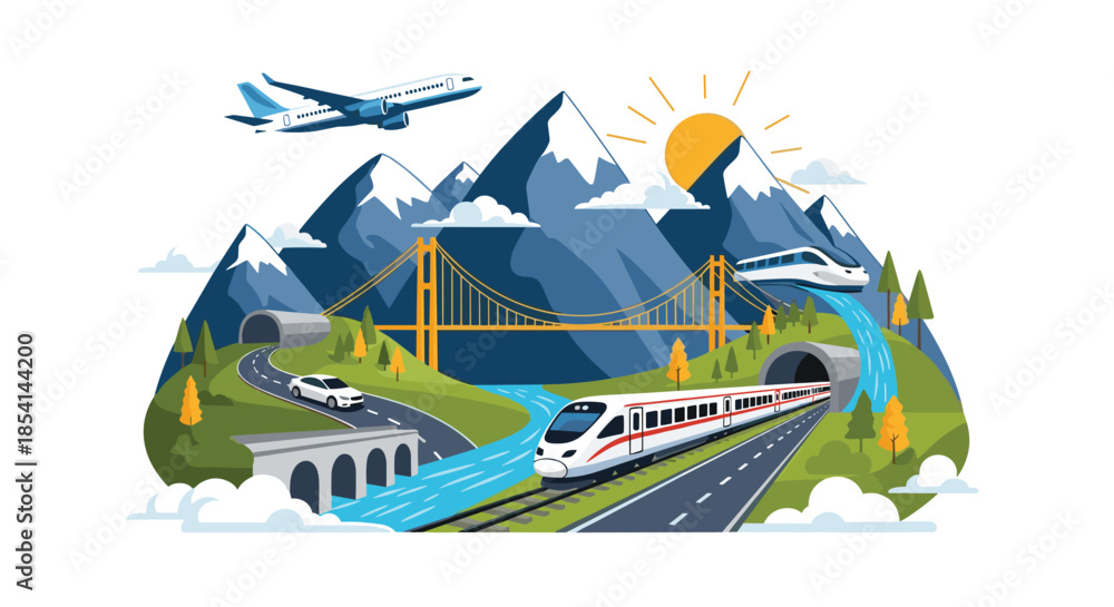 Transportation landscape showing a passenger plane a car a high speed train and a bridge over a river in mountains. #1854144200