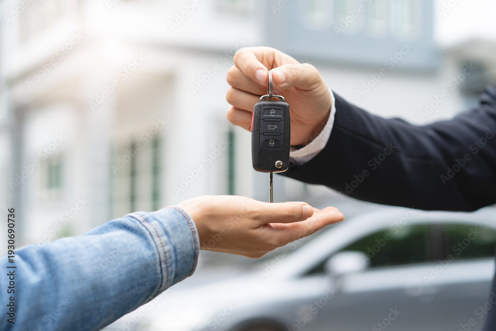 transportation rental automotive business concept. Close up hands of rental auto agent giving car remote key to client to travel sightseeing. #1930690736