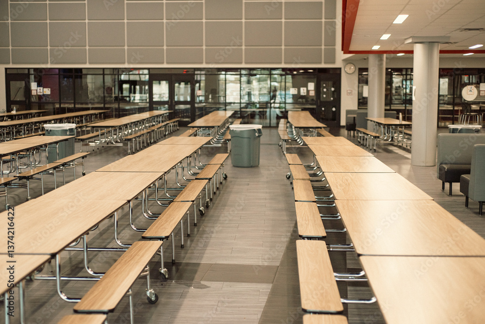Trash cans setup between row of empty rectangle mobile cafeteria table with bench seats for easy sit close, spread out at middle school in Dallas, Texas, laminate top resists scratches and stains #1374216422