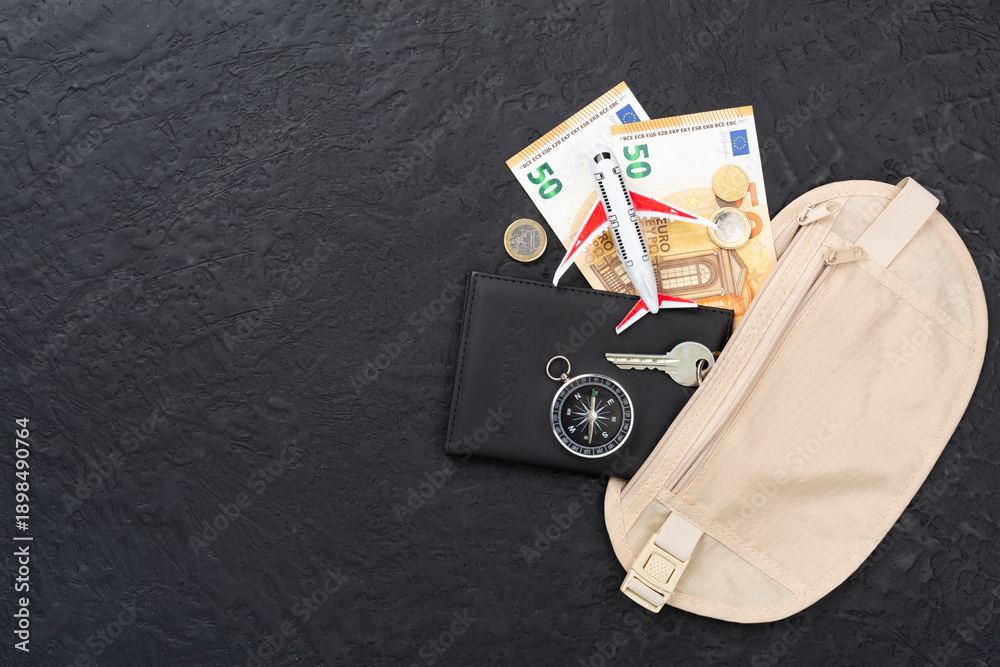 Traveler organizer bag with passport and accessories on concrete background, top view #1898490764