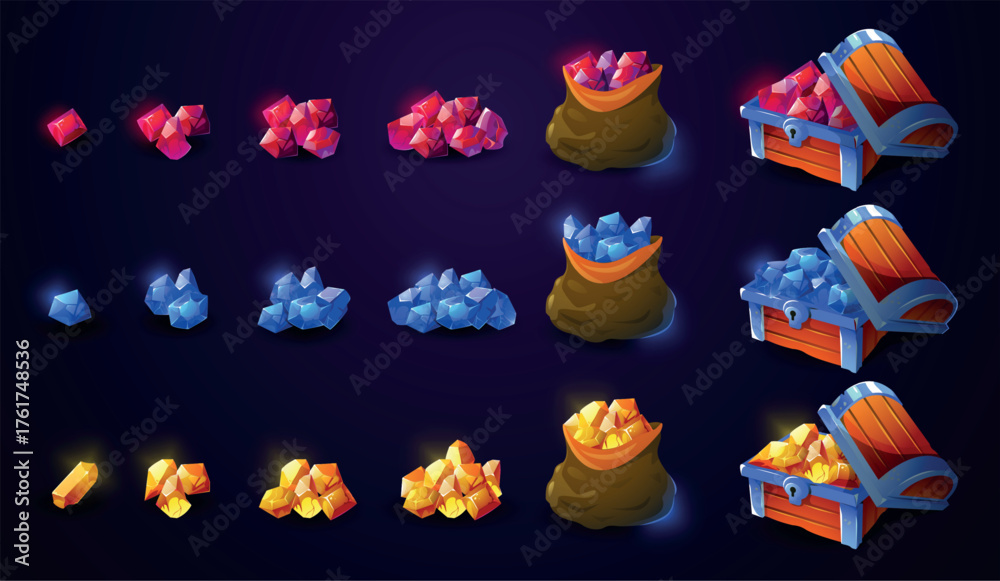 Treasure chest. Cartoon crystal pile rewards, fantasy wooden chest with glowing gemstones, fantasy pirate game element. Vector crystals asset isolated set #1761748536