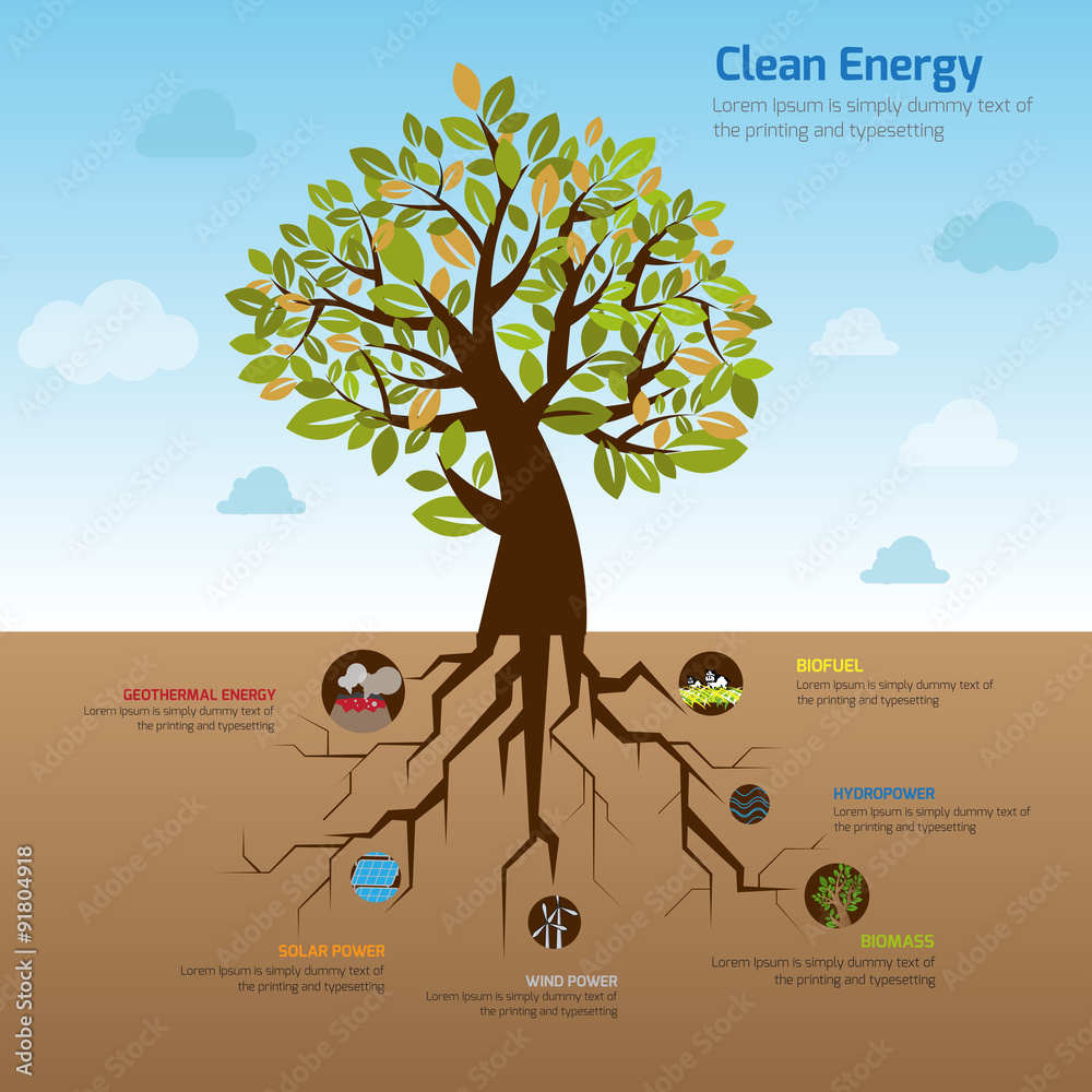 Tree root representing clean energy infographic diagram template design with decorative icon in blue sky of green world environment, create by vector #91804918