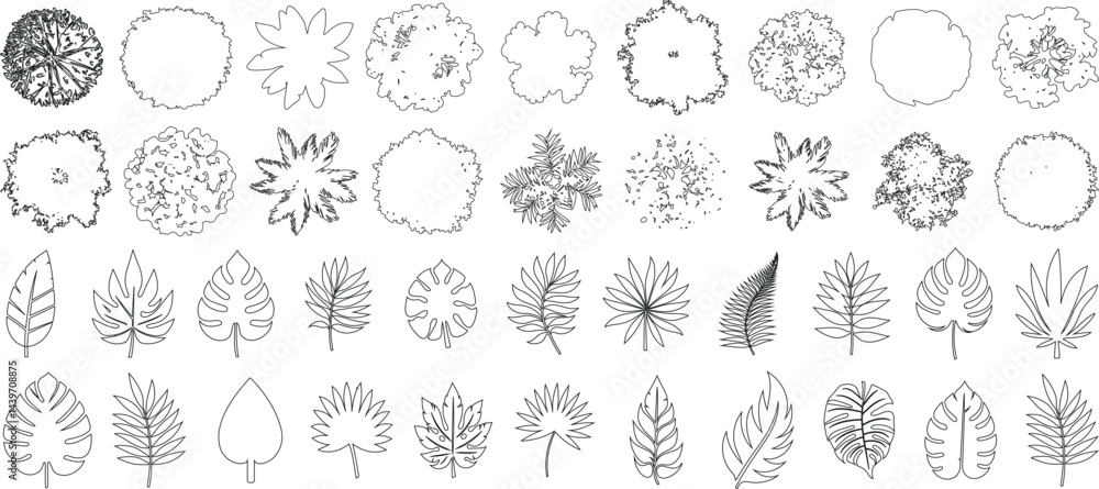 • #1439708875 Tree top view, leaf icon set, plant illustration set for architectural design. Tree top view vector collection features diverse tree and leaf sketches for landscape planning, botanical art