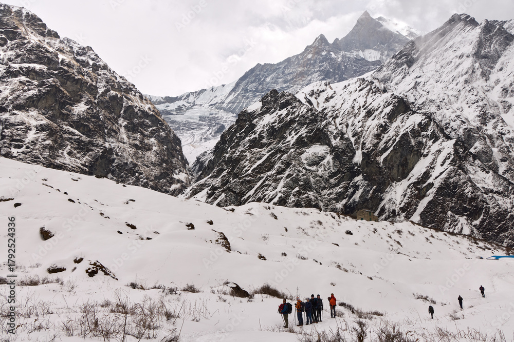 Trekkers walk through snow-covered terrain in the Himalayas. They are on the path to Annapurna Base Camp in Nepal. Majestic mountains loom in the background #1792524336