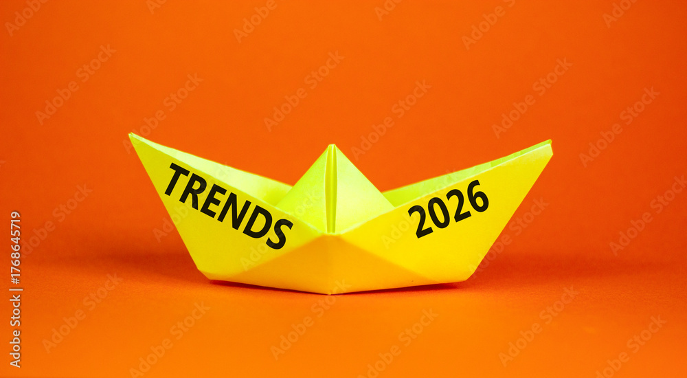 Trends 2026 new year symbol. Concept words Trends 2026 on beautiful yellow paper boat. Beautiful orange paper background. Business and Trends 2026 new year concept. Copy space. #1768645719