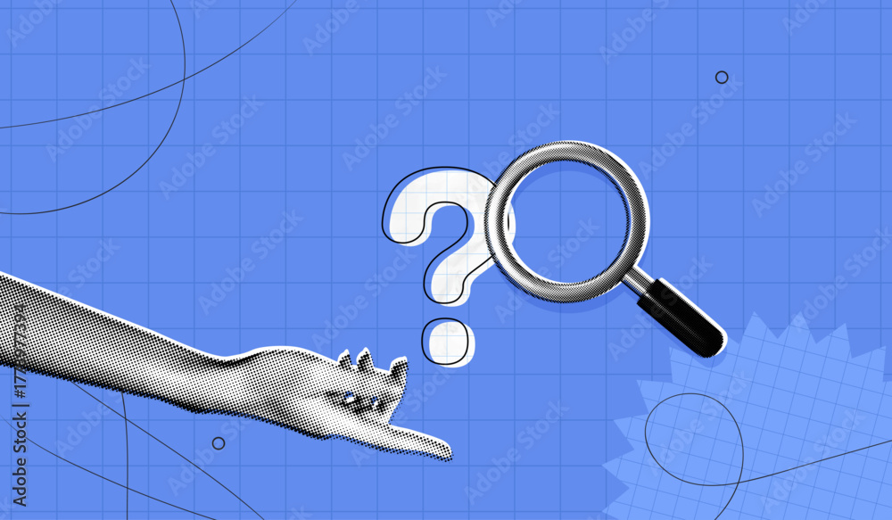 Trendy Halftone Collage Hand with question mark and magnifying glass. Find solution or answer to cause or incident. Problem analysis. Ask for reply. Contemporary vector illustration art #1778977394