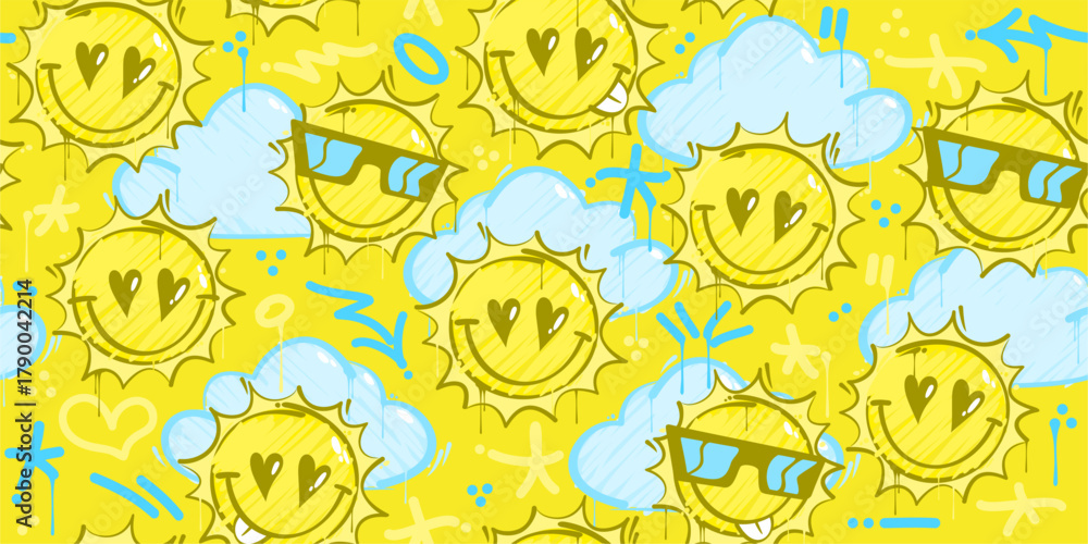 Trendy Yellow Abstract Graffiti Style Happy Smiling Suns On the Sky Seamless Background Template #1790042214