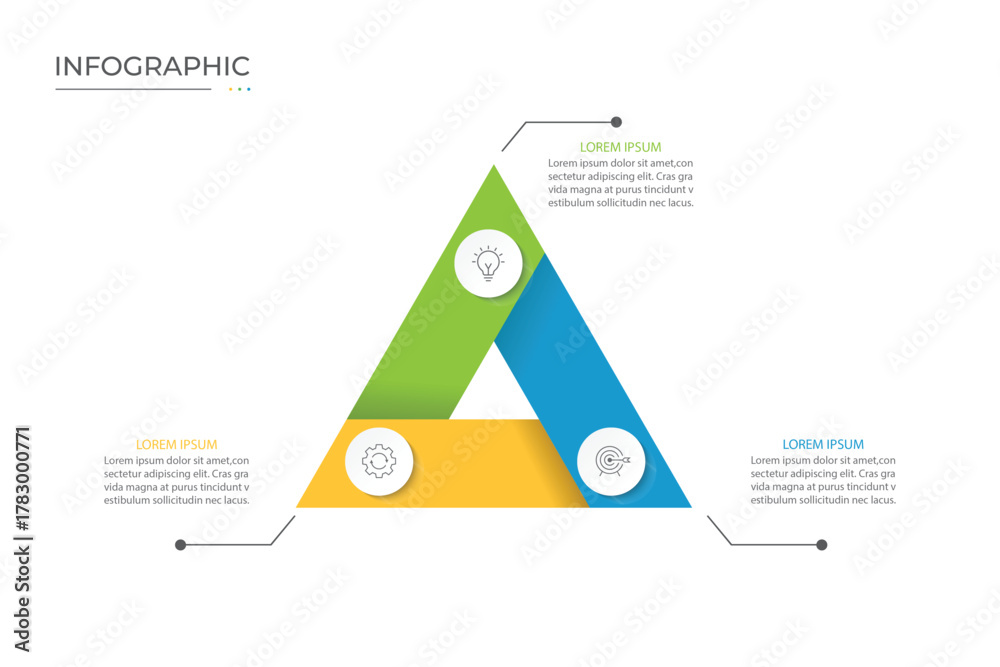 Triangle diagram with three elements. Cyclic business process concept with three stages. Minimalist infographic design template. Vector illustration. #1783000771