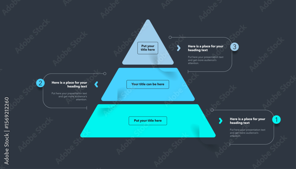 Triangle pyramid chart template with three colorful stages - dark version. Infographic diagram divided into three options with numbers. #1569212260