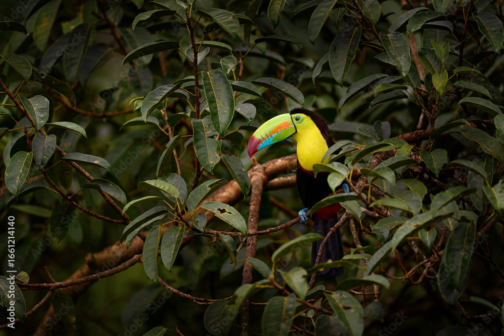 Tropic wildlife. Flying Keel-billed Toucan, Ramphastos sulfuratus, bird with big bill fly above the forest. Beautiful wildlife scene. Animal in nature forest habitat, Costa Rica. #1661214140