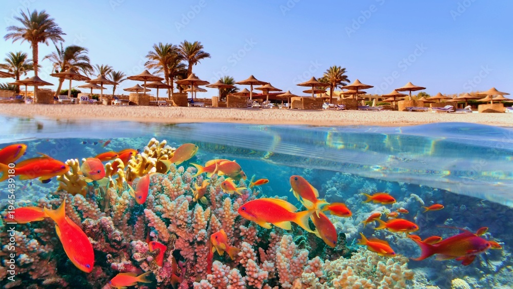 Tropical coral reef and fish with beach with palms and sun umbrelas on the background, Red Sea, Egypt #1945439180