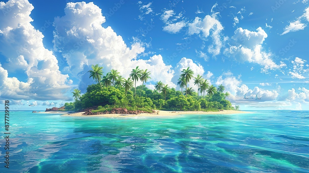 Tropical island scenes depict the beauty of exotic landscapes with lush greenery and vibrant waters perfect for tropical-themed backgrounds Background Illustration, Bright color tones, , Minimalism, #877739978