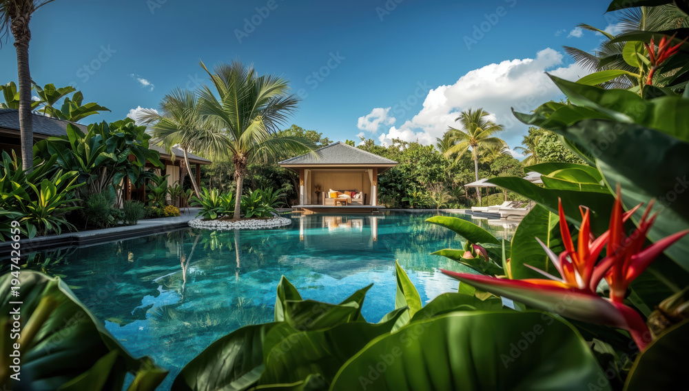 Tropical villa pool surrounded by lush foliage and bright heliconia flowers, serene luxury #1947426659