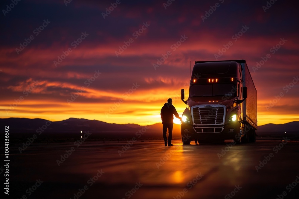 Truck Driver Walking Around the Truck at Sunset on a Lonely Highway #1004136502