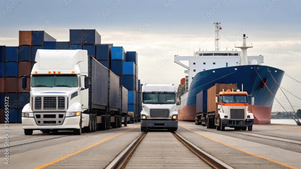 Trucks and a cargo ship loaded with containers at a dock, highlighting intermodal freight transport and logistics. #1566595172