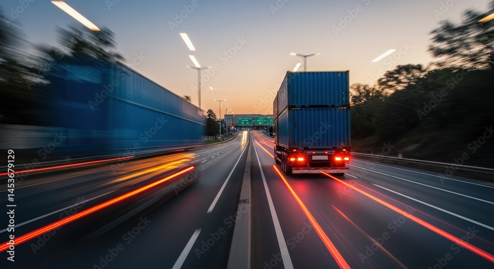 Trucks Driving on Highway at Dusk with Motion Blur #1453679129