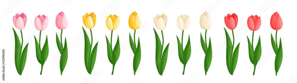 Tulips flowers set. Floral plants with bright petals. Botanical vector illustration on isolated background. Spring flowers for women's day, mother's day, easter and other holidays. #733992420