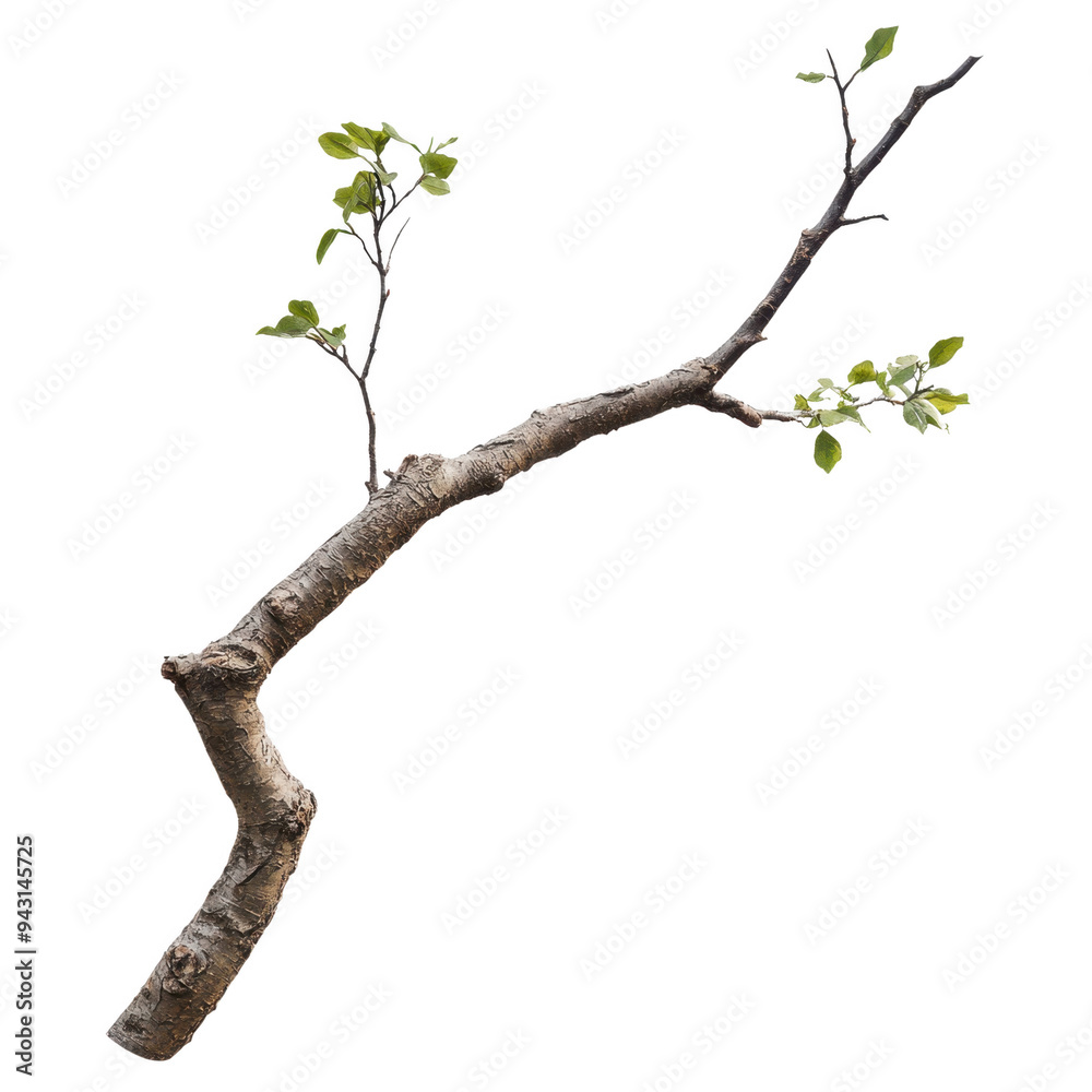 Twisted Branch of Life, a gnarled tree limb showcasing fresh green leaves cut out transparent isolated on white background PNG #943145725