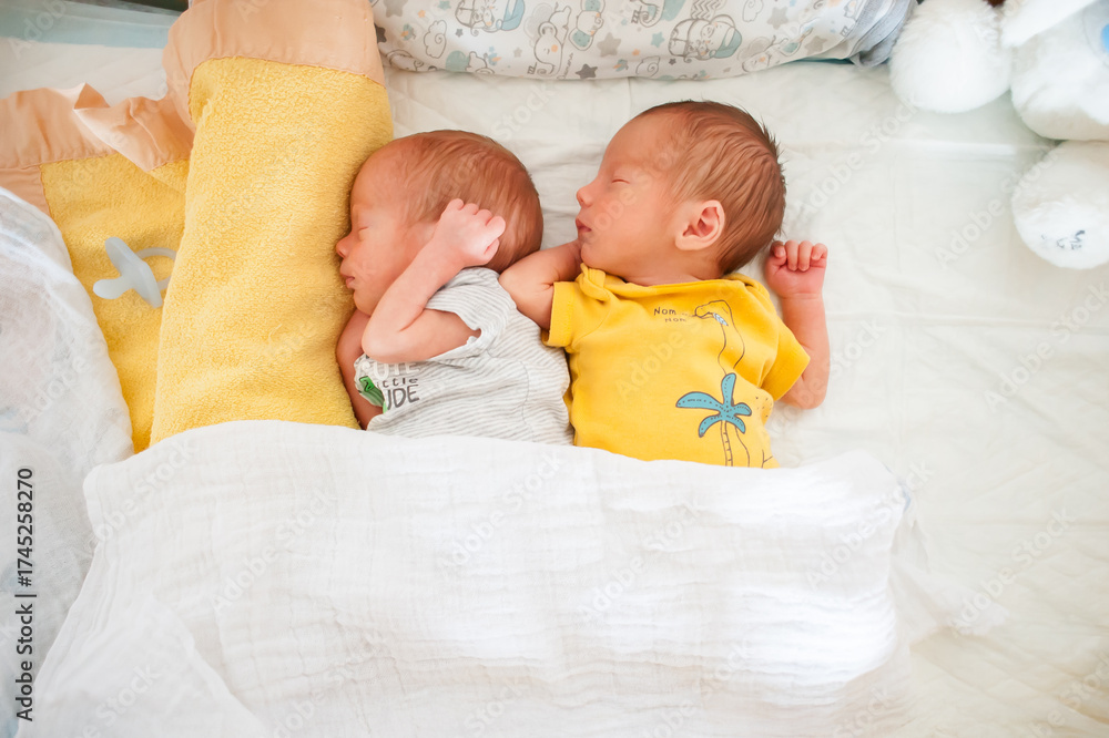 Two adorable newborn twins lie side by side, peacefully sleeping under soft, warm blankets in a bright nursery filled with gentle sunlight. Their tiny bodies are relaxed and tranquil. #1745258270