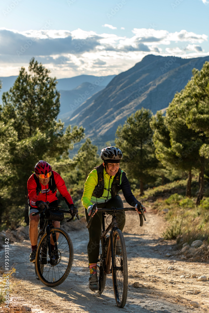 Two adults ride gravel bikes on a sunny dirt path through a pine forest toward distant mountains, enjoying summer adventure, fitness and freedom on a scenic spanish trail - stock photo #1939311342