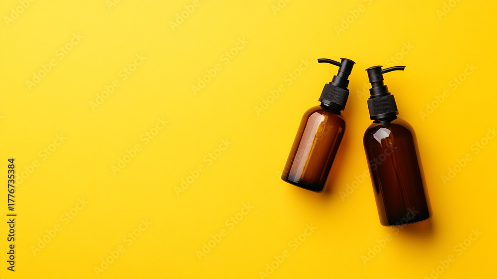 Two amber glass bottles with black pump dispensers for cosmetics on a bright yellow background. #1776735384