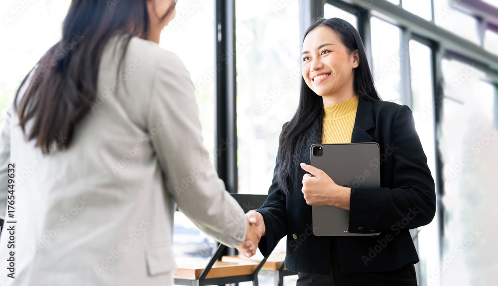 Two Asian businesswomen finalize a deal with a firm handshake in the office. #1765449632