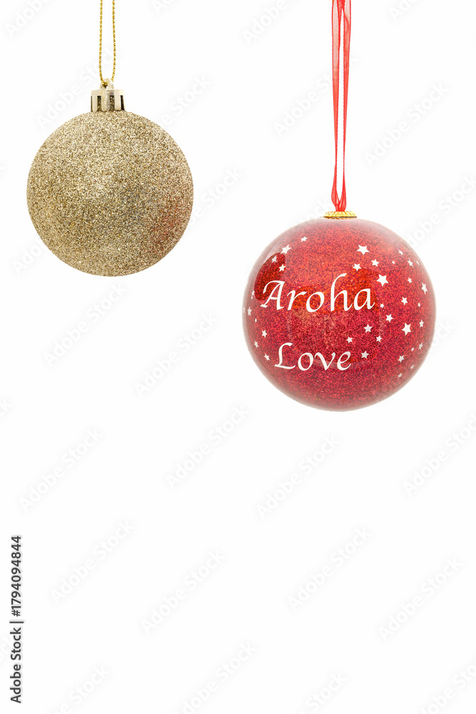 Two beautiful Christmas baubles seen against a plain white background. On one decoration is written Aroha which is the Maori word for Love. #1794094844