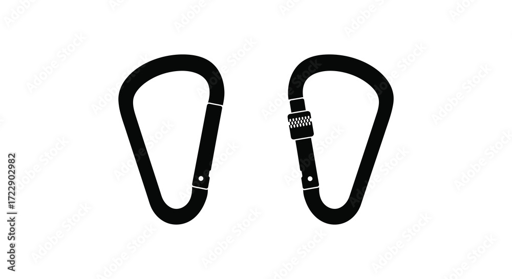Two black carabiners displayed against a stark white background simple design #1722902982