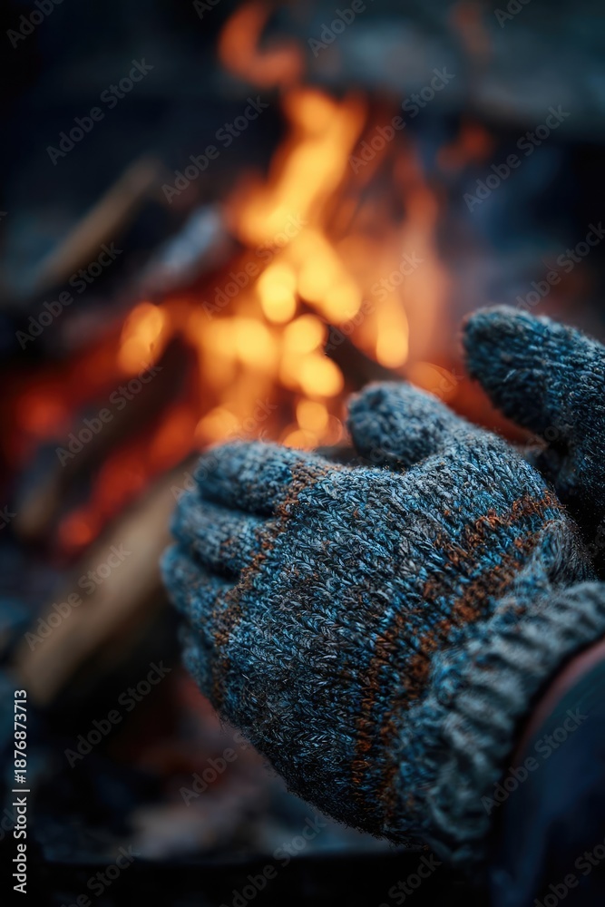 Two blue knitted gloves held close to a blazing campfire. Concept Blue knitted gloves, Campfire warmth, Nighttime outdoors, Cozy glow, Hand warmth by fire #1876873713