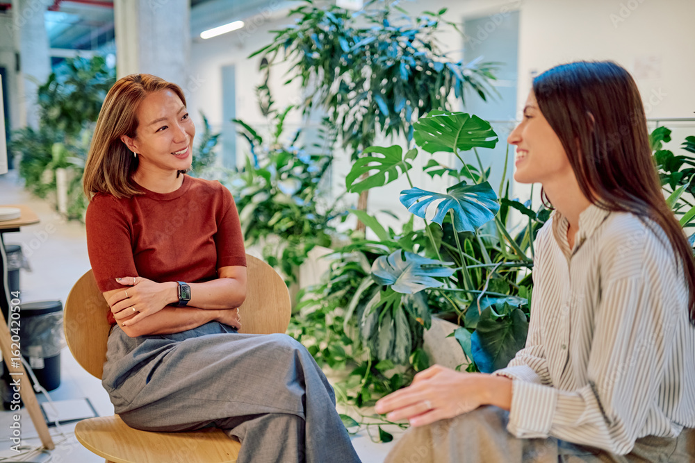 Two businesswomen are having a conversation in a modern office full of plants, enjoying a friendly chat during a break #1620420504