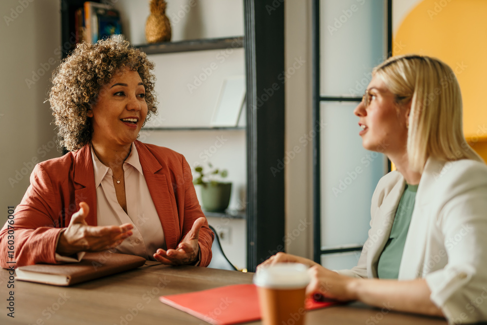 Two businesswomen having a conversation at the office #1603076001