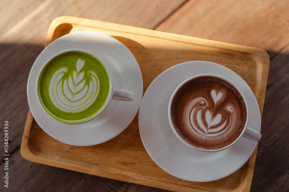 Two cups of latte art put on a wooden tray, one vibrant green matcha and the other rich brown cocoa. Each has a delicate, heart-shaped design, creating a cozy and inviting scene in warm sunlight. #1344289336