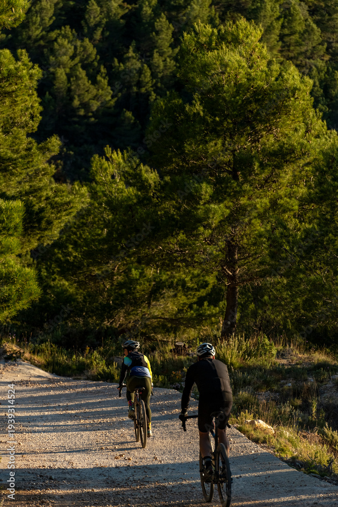 Two cyclists ride gravel bikes along a sunlit dirt trail through green pine forest near alicante, Spain, enjoying outdoor fitness, adventure and scenic summer landscape - stock photo #1939314524