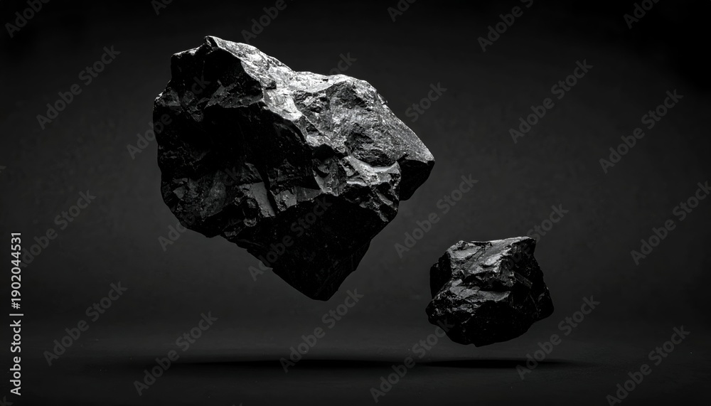 Two dark, jagged stones float against a muted gray background #1902044531