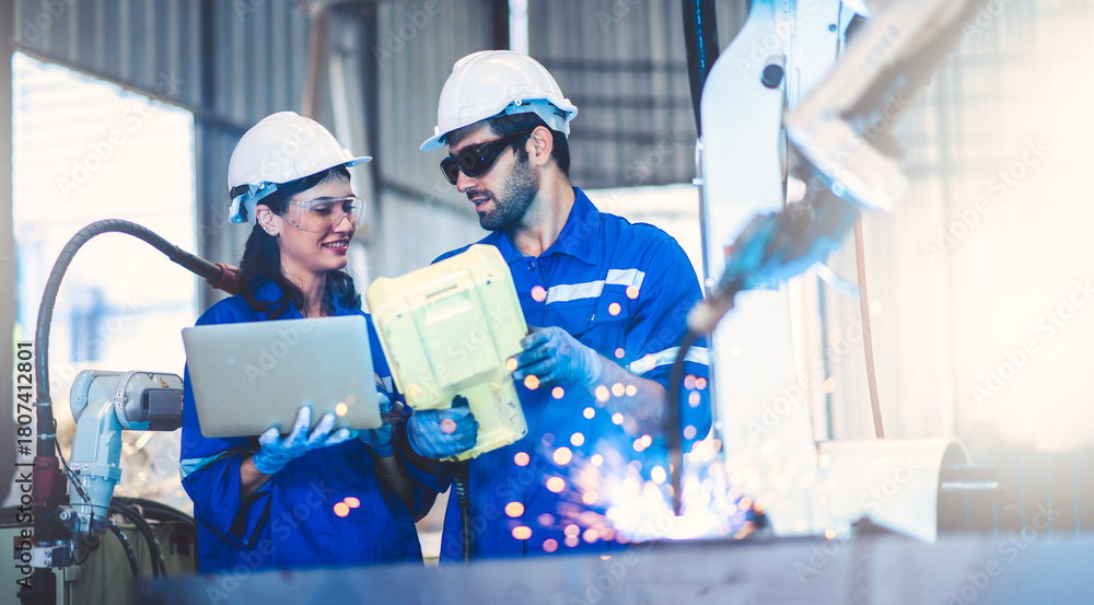 Two engineers mechanic using computer controller Robotic arm for welding steel in steel factory workshop. Industry robot programming software for automated manufacturing technology #1807412801