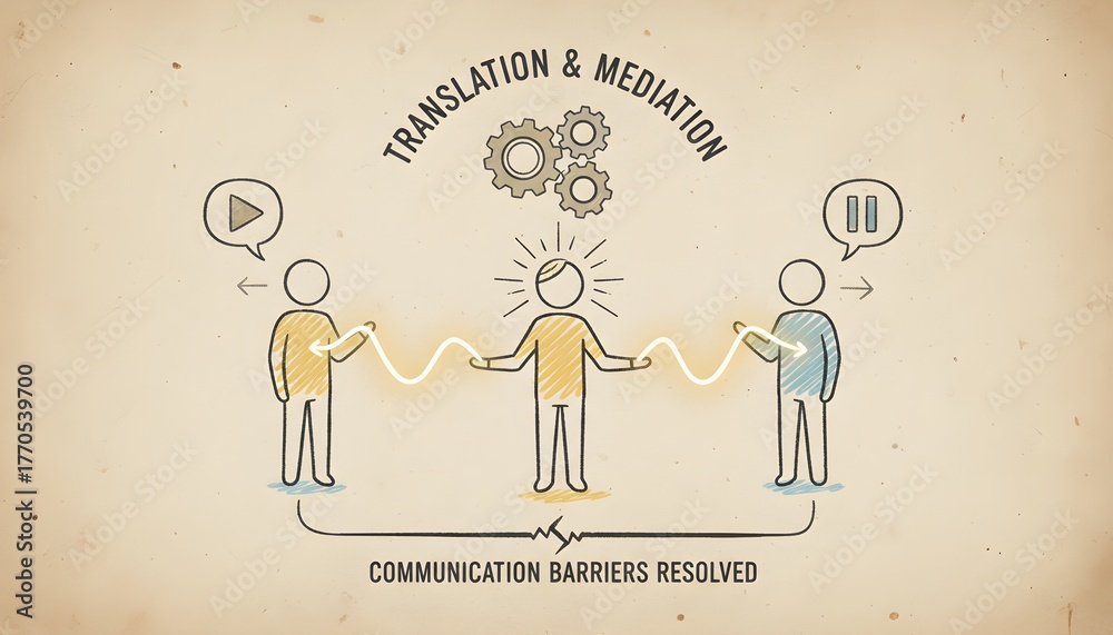 Two figures connected by a mediator, symbolizing translation and mediation overcoming communication barriers. #1770539700