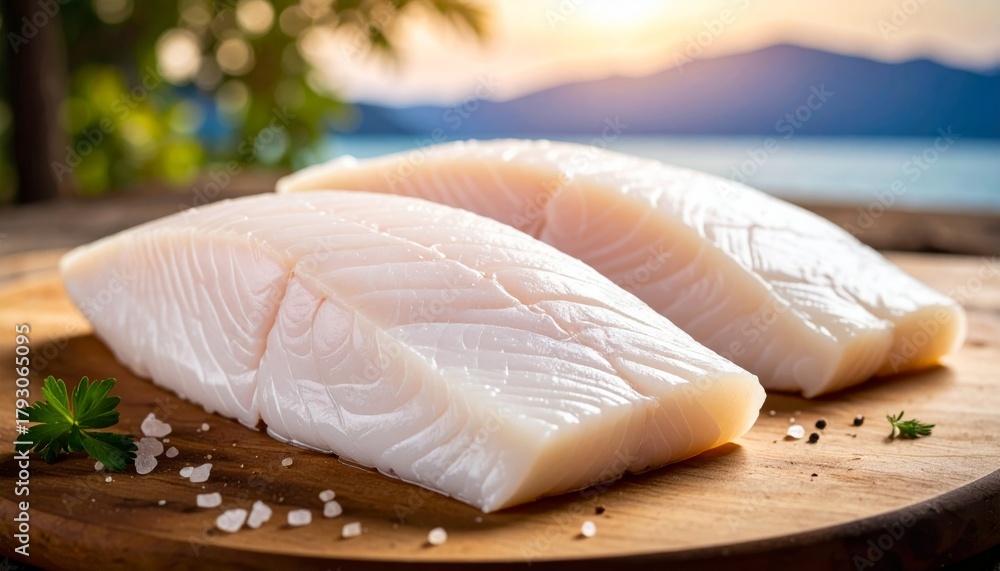 Two Fresh Cod Fillet on Wooden Board, Beach Sunset Background, Close Up, Seafood, Food Photography Seafood, Cod #1793065095