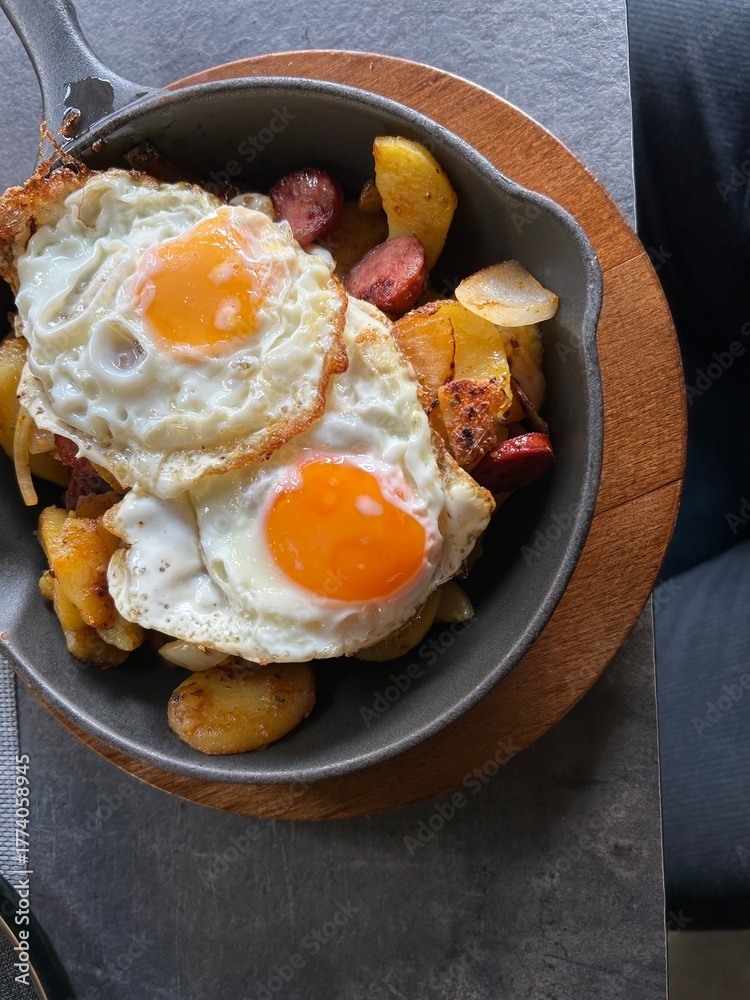 two fried eggs with fried potatoes in cast iron pan #1774058945