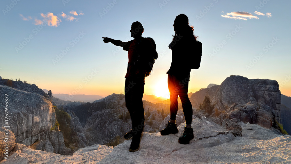 Two friends are having a good time in nature, planning new routes. #1752955377