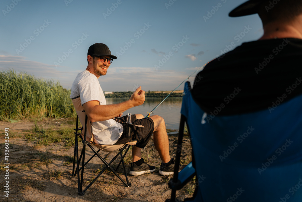 Two friends fishing and relaxing on a lake shore on a warm summer evening #1936062491