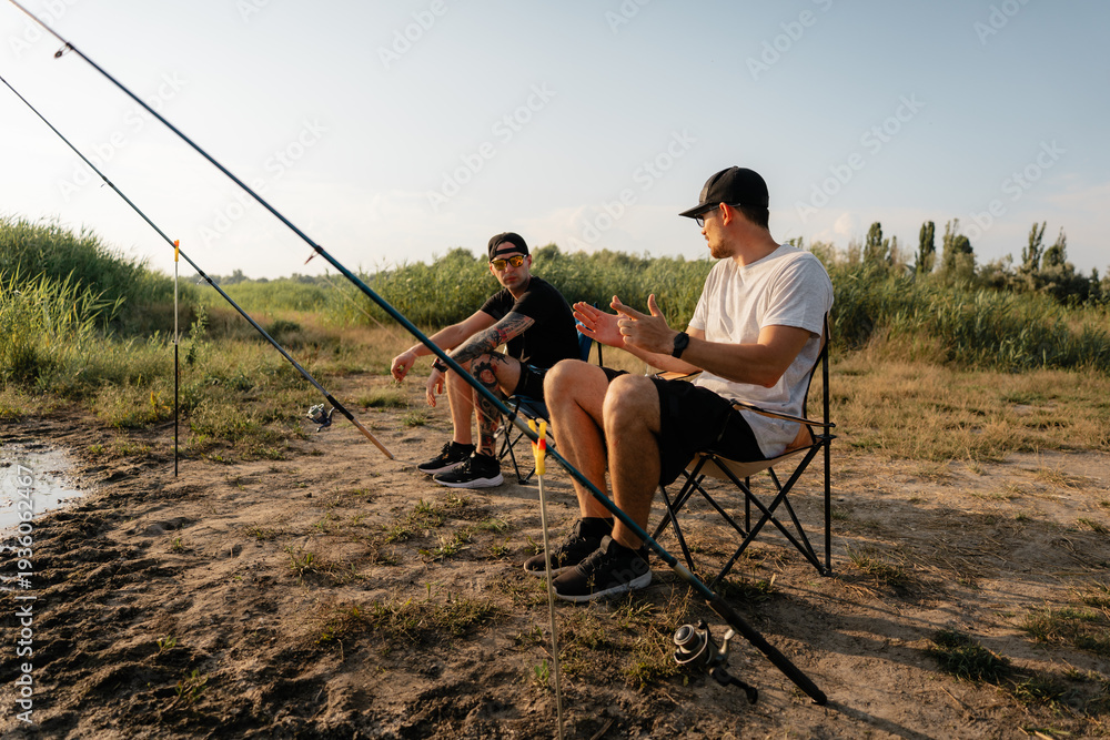 Two friends fishing and talking on the lakeshore at sunset, relaxed outdoor summer activity #1936062467