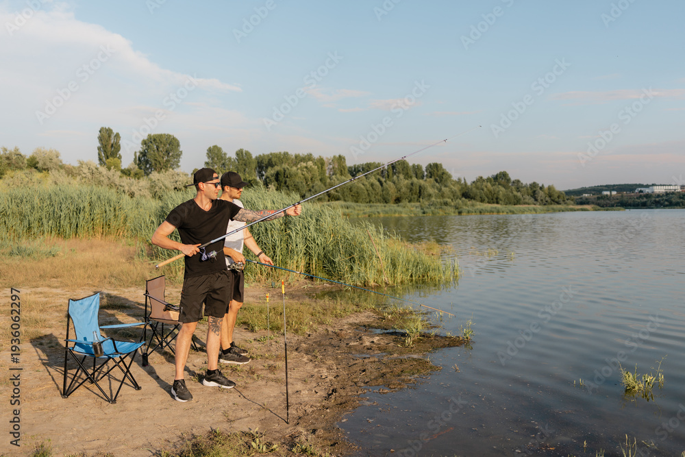 Two friends fishing at a lakeshore on a warm summer evening with rods and folding chairs #1936062297