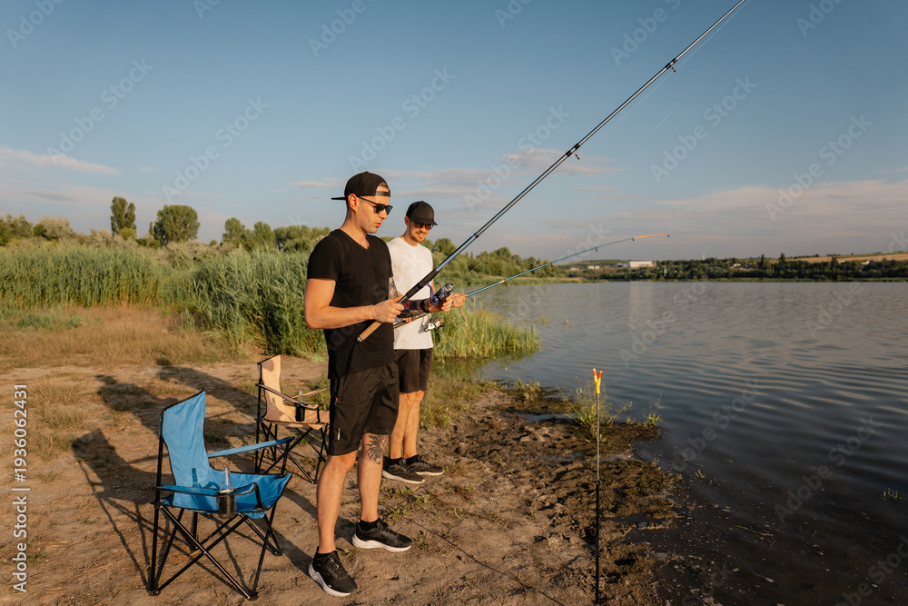 Two friends fishing at a lakeside on a sunny summer evening with folding chairs and rods #1936062431
