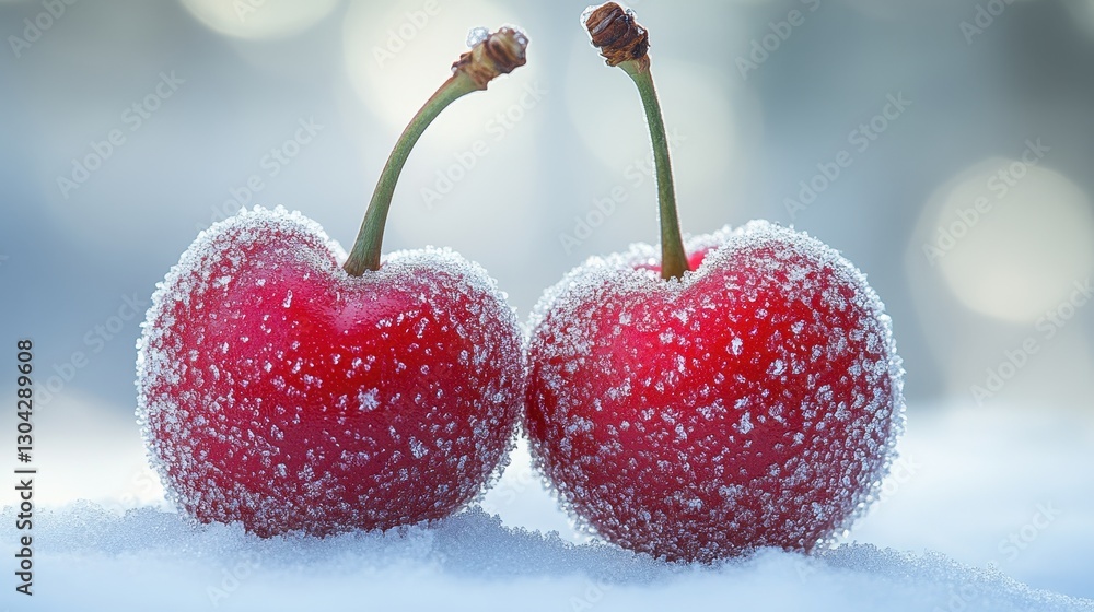 Two frozen cherries, glistening with icy crystals, stand sentinel against a backdrop of pristine white snow, a testament to the beauty of a winter wonderland. #1304289608