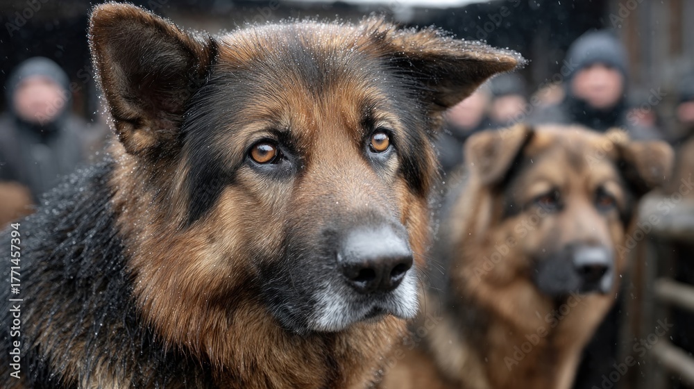 Two German Shepherds stand attentively, with one dog in the foreground capturing attention. setting is cold and snowy, with people dressed warmly in the background #1771457394