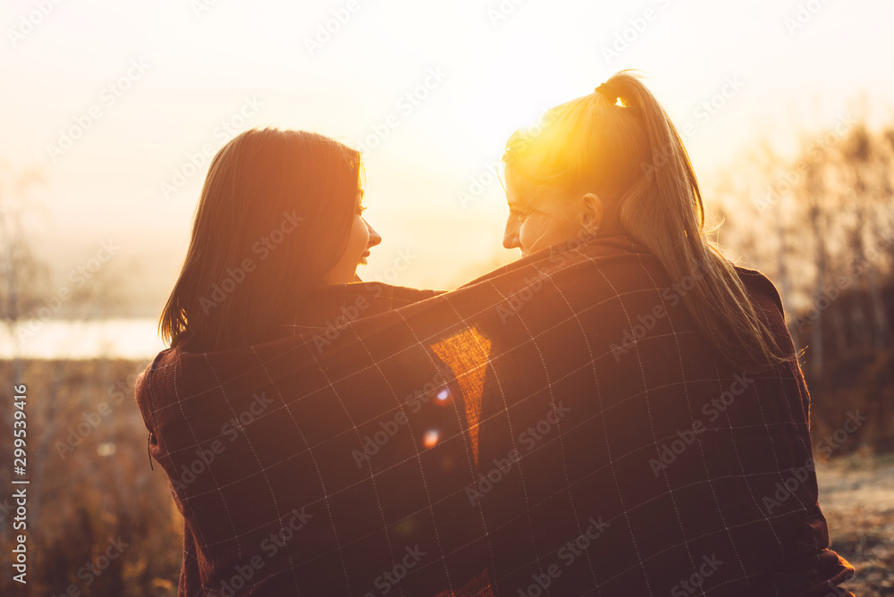Two girlfriends are sitting under a blanket and laughing. Female friendship and outdoor recreation. #299539416